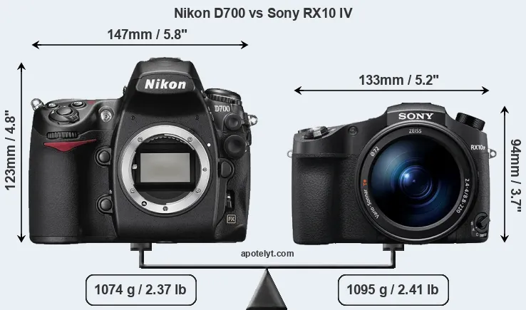 An illustration of the physical size and weight of the Nikon D700 and the Sony RX10 IV is provided in the side-by-side display below. The two cameras are presented according to their relative size. Three successive views from the front, the top, and the rear are shown. All width, height and depth dimensions are rounded to the nearest millimeter.