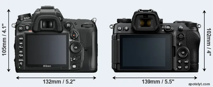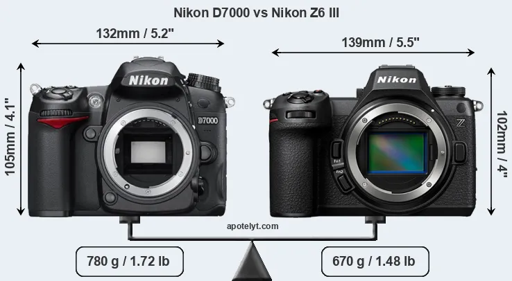 The side-by-side display below illustrates the physical size and weight of the Nikon D7000 and the Nikon Z6 III. The two cameras are presented according to their relative size. Three consecutive perspectives from the front, the top, and the back are available. All width, height and depth measures are rounded to the nearest millimeter.