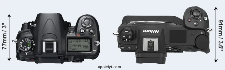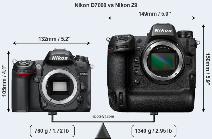 The physical size and weight of the Nikon D7000 and the Nikon Z9 are illustrated in the side-by-side display below. The two cameras are presented according to their relative size. Three successive views from the front, the top, and the rear are shown. All width, height and depth dimensions are rounded to the nearest millimeter.