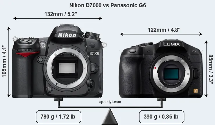 An illustration of the physical size and weight of the Nikon D7000 and the Panasonic G6 is provided in the side-by-side display below. The two cameras are presented according to their relative size. Three consecutive perspectives from the front, the top, and the back are available. All width, height and depth dimensions are rounded to the nearest millimeter.