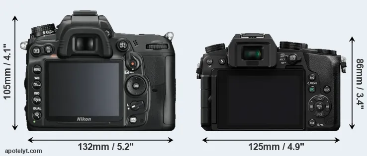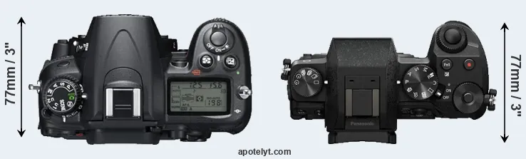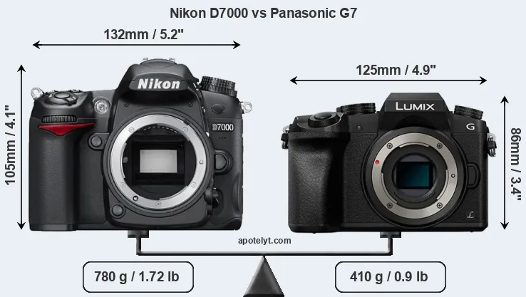 The side-by-side display below illustrates the physical size and weight of the Nikon D7000 and the Panasonic G7. The two cameras are presented according to their relative size. Three consecutive perspectives from the front, the top, and the back are available. All width, height and depth measures are rounded to the nearest millimeter.
