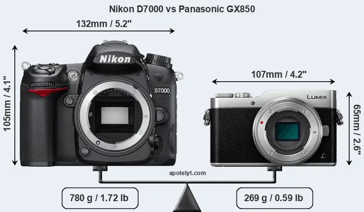 The physical size and weight of the Nikon D7000 and the Panasonic GX850 are illustrated in the side-by-side display below. The two cameras are presented according to their relative size. Three consecutive views from the front, the top, and the rear side are shown. All width, height and depth measures are rounded to the nearest millimeter.