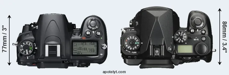 The physical size and weight of the Nikon D7000 and the Pentax K-1 II are illustrated in the side-by-side display below. The two cameras are presented according to their relative size. Three consecutive perspectives from the front, the top, and the back are available. All size dimensions are rounded to the nearest millimeter.