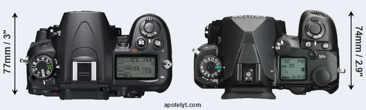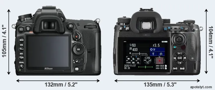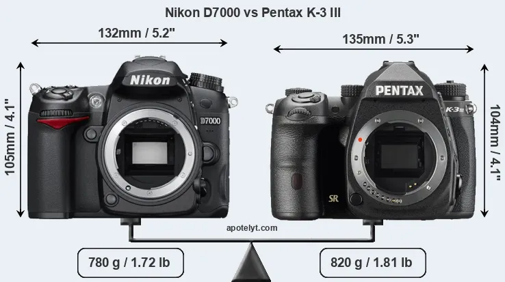 The side-by-side display below illustrates the physical size and weight of the Nikon D7000 and the Pentax K-3 III. The two cameras are presented according to their relative size. Three successive views from the front, the top, and the rear are shown. All width, height and depth dimensions are rounded to the nearest millimeter.