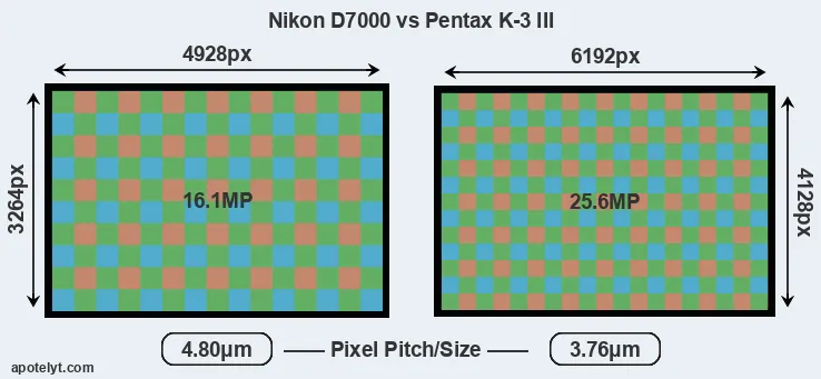 Despite having a slightly smaller sensor, the K-3 III offers a higher resolution of 25.6 megapixels, compared with 16.1 MP of the D7000. This megapixels advantage comes at the cost of a higher pixel density and a smaller size of the individual pixel (with a pixel pitch of 3.76μm versus 4.80μm for the D7000). However, it should be noted that the K-3 III is much more recent (by 10 years and 6 months) than the D7000, and its sensor will have benefitted from technological advances during this time that make it possible to gather light more efficiently. Coming back to sensor resolution, it should be mentioned that the K-3 III has no anti-alias filter installed, so that it can capture all the detail its sensor resolves.