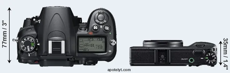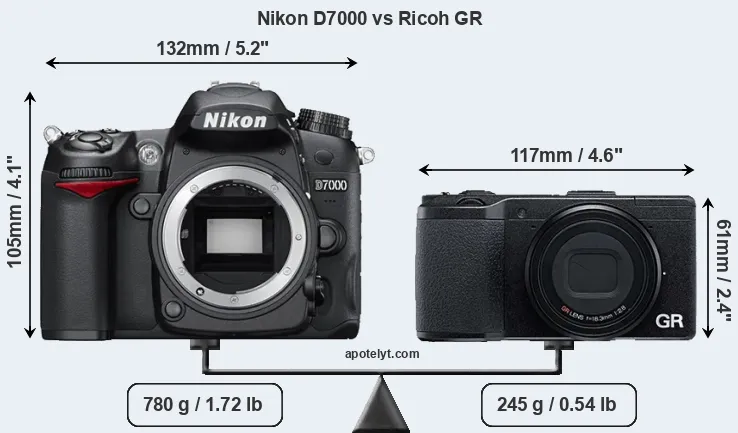 The physical size and weight of the Nikon D7000 and the Ricoh GR are illustrated in the side-by-side display below. The two cameras are presented according to their relative size. Three consecutive perspectives from the front, the top, and the back are available. All width, height and depth measures are rounded to the nearest millimeter.