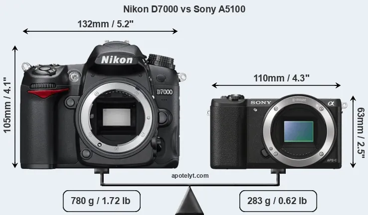 The physical size and weight of the Nikon D7000 and the Sony A5100 are illustrated in the side-by-side display below. The two cameras are presented according to their relative size. Three successive views from the front, the top, and the rear are shown. All width, height and depth measures are rounded to the nearest millimeter.