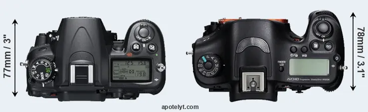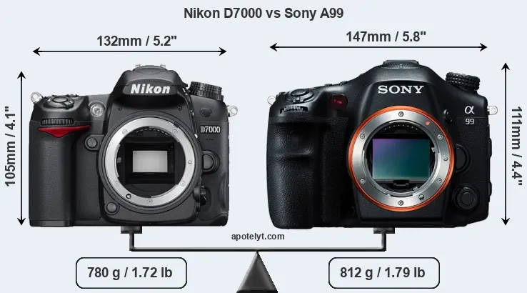 The side-by-side display below illustrates the physical size and weight of the Nikon D7000 and the Sony A99. The two cameras are presented according to their relative size. Three consecutive perspectives from the front, the top, and the back are available. All width, height and depth measures are rounded to the nearest millimeter.