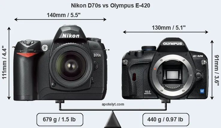 If the front view area (width x height) of the cameras is taken as an aggregate measure of their size, the Olympus E-420 is notably smaller (24 percent) than the Nikon D70s. Moreover, the E-420 is substantially lighter (35 percent) than the D70s. In this context, it is worth noting that neither the D70s nor the E-420 are weather-sealed.