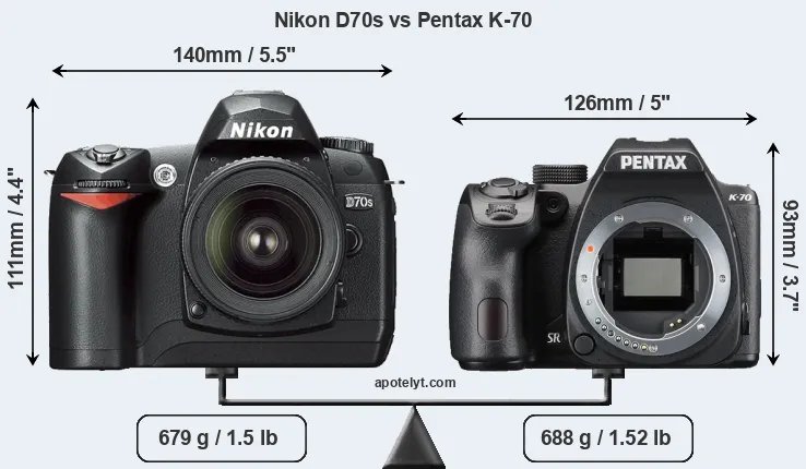 The physical size and weight of the Nikon D70s and the Pentax K-70 are illustrated in the side-by-side display below. The two cameras are presented according to their relative size. Three consecutive perspectives from the front, the top, and the back are available. All size dimensions are rounded to the nearest millimeter.