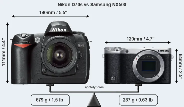 If the front view area (width x height) of the cameras is taken as an aggregate measure of their size, the Samsung NX500 is considerably smaller (51 percent) than the Nikon D70s. Moreover, the NX500 is substantially lighter (58 percent) than the D70s. In this context, it is worth noting that neither the D70s nor the NX500 are weather-sealed.