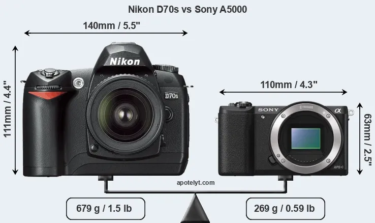If the front view area (width x height) of the cameras is taken as an aggregate measure of their size, the Sony A5000 is considerably smaller (55 percent) than the Nikon D70s. Moreover, the A5000 is substantially lighter (60 percent) than the D70s. In this context, it is worth noting that neither the D70s nor the A5000 are weather-sealed.