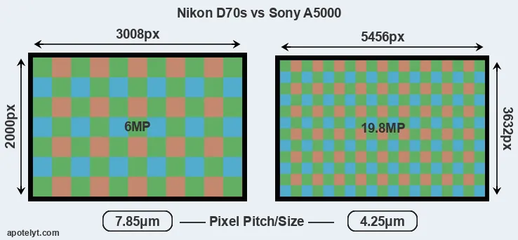 Despite having a slightly smaller sensor, the A5000 offers a higher resolution of 19.8 megapixels, compared with 6 MP of the D70s. This megapixels advantage comes at the cost of a higher pixel density and a smaller size of the individual pixel (with a pixel pitch of 4.25μm versus 7.85μm for the D70s). However, it should be noted that the A5000 is much more recent (by 8 years and 8 months) than the D70s, and its sensor will have benefitted from technological advances during this time that make it possible to gather light more efficiently.