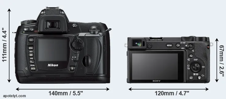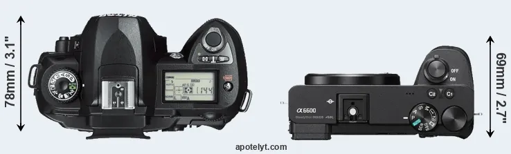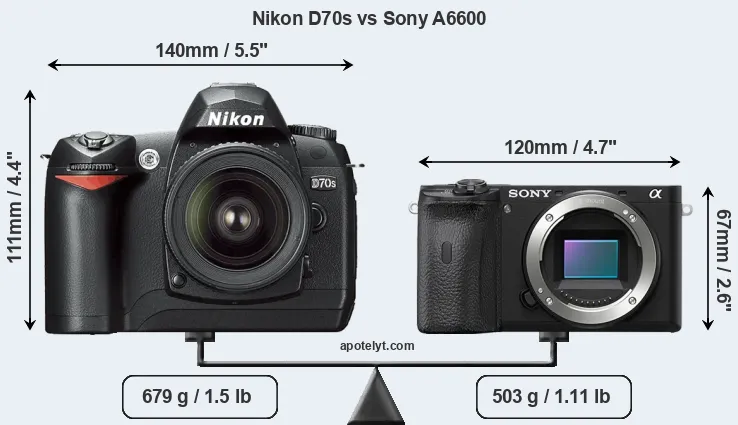 The side-by-side display below illustrates the physical size and weight of the Nikon D70s and the Sony A6600. The two cameras are presented according to their relative size. Three consecutive perspectives from the front, the top, and the back are available. All width, height and depth measures are rounded to the nearest millimeter.