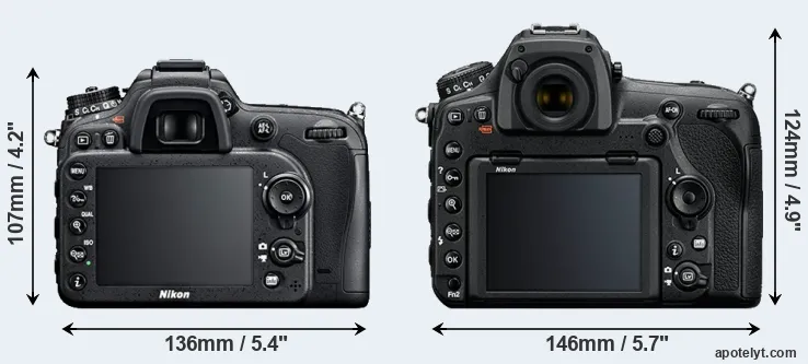 The side-by-side display below illustrates the physical size and weight of the Nikon D7100 and the Nikon D850. The two cameras are presented according to their relative size. Three successive views from the front, the top, and the rear are shown. All width, height and depth measures are rounded to the nearest millimeter.
