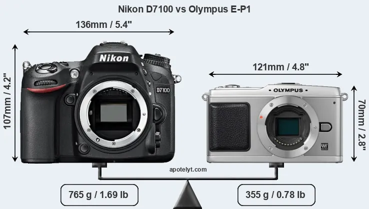 The physical size and weight of the Nikon D7100 and the Olympus E-P1 are illustrated in the side-by-side display below. The two cameras are presented according to their relative size. Three consecutive views from the front, the top, and the rear side are shown. All size dimensions are rounded to the nearest millimeter.