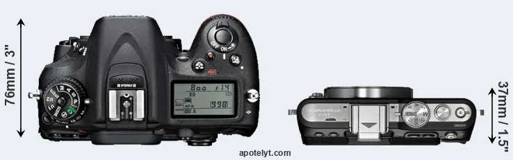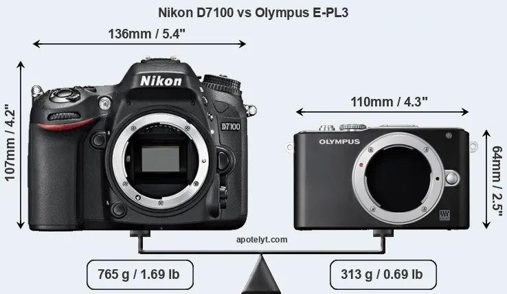 An illustration of the physical size and weight of the Nikon D7100 and the Olympus E-PL3 is provided in the side-by-side display below. The two cameras are presented according to their relative size. Three consecutive perspectives from the front, the top, and the back are available. All width, height and depth measures are rounded to the nearest millimeter.