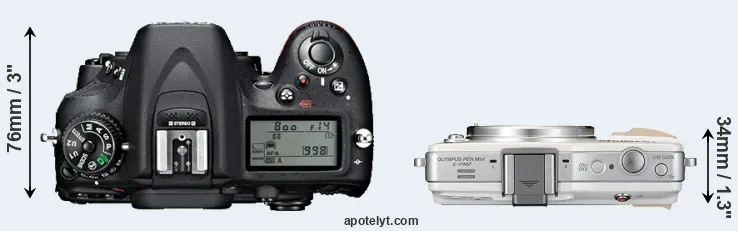 The physical size and weight of the Nikon D7100 and the Olympus E-PM2 are illustrated in the side-by-side display below. The two cameras are presented according to their relative size. Three successive views from the front, the top, and the rear are shown. All width, height and depth dimensions are rounded to the nearest millimeter.