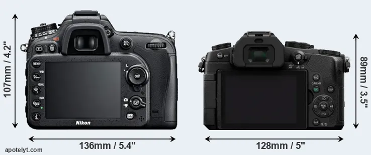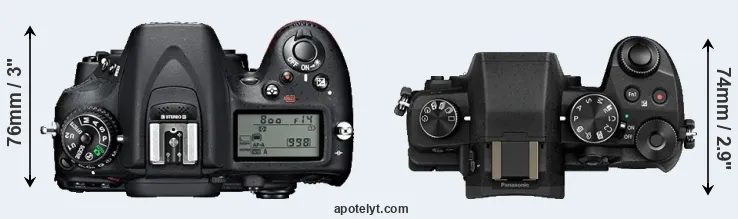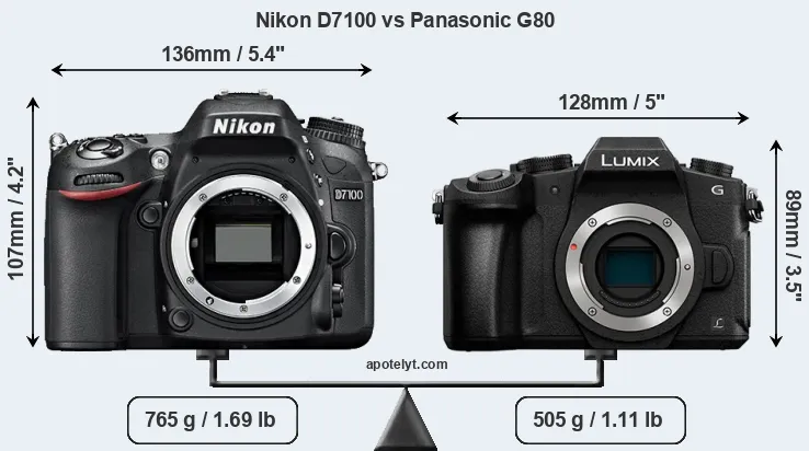 The side-by-side display below illustrates the physical size and weight of the Nikon D7100 and the Panasonic G80. The two cameras are presented according to their relative size. Three consecutive perspectives from the front, the top, and the back are available. All width, height and depth dimensions are rounded to the nearest millimeter.