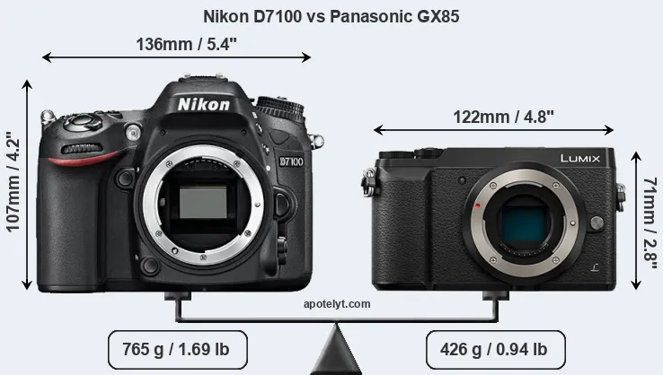 If the front view area (width x height) of the cameras is taken as an aggregate measure of their size, the Panasonic GX85 is considerably smaller (40 percent) than the Nikon D7100. Moreover, the GX85 is substantially lighter (44 percent) than the D7100. It is worth mentioning in this context that the D7100 is splash and dust resistant, while the GX85 does not feature any corresponding weather-sealing.