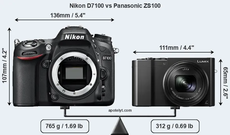An illustration of the physical size and weight of the Nikon D7100 and the Panasonic ZS100 is provided in the side-by-side display below. The two cameras are presented according to their relative size. Three consecutive views from the front, the top, and the rear side are shown. All width, height and depth dimensions are rounded to the nearest millimeter.