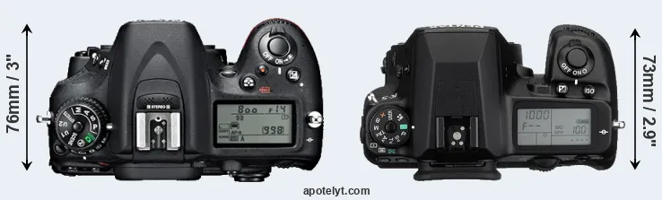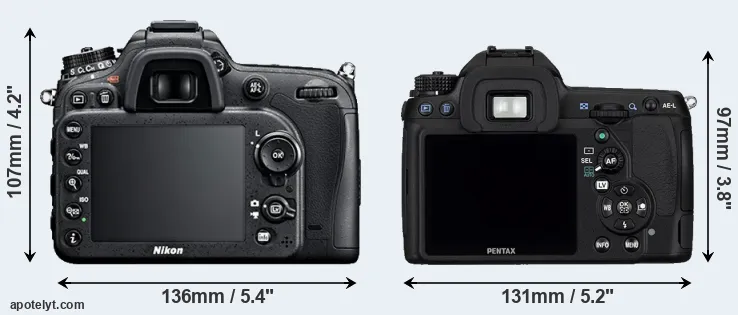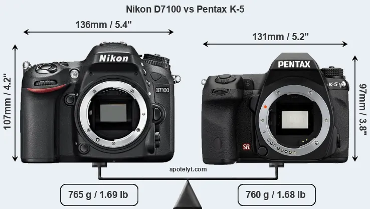 The side-by-side display below illustrates the physical size and weight of the Nikon D7100 and the Pentax K-5. The two cameras are presented according to their relative size. Three consecutive views from the front, the top, and the rear side are shown. All size dimensions are rounded to the nearest millimeter.