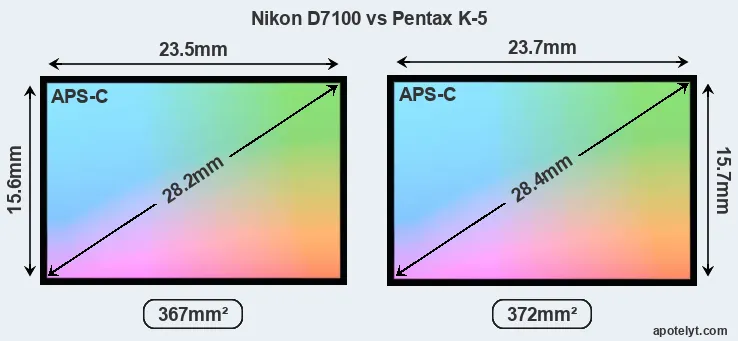 Both cameras under consideration feature an APS-C sensor, but their sensors differ slightly in size. The sensor area in the K-5 is 1 percent bigger. They nevertheless have the same format factor of 1.5. Both cameras have a native aspect ratio (sensor width to sensor height) of 3:2.