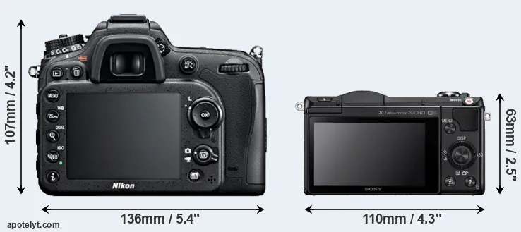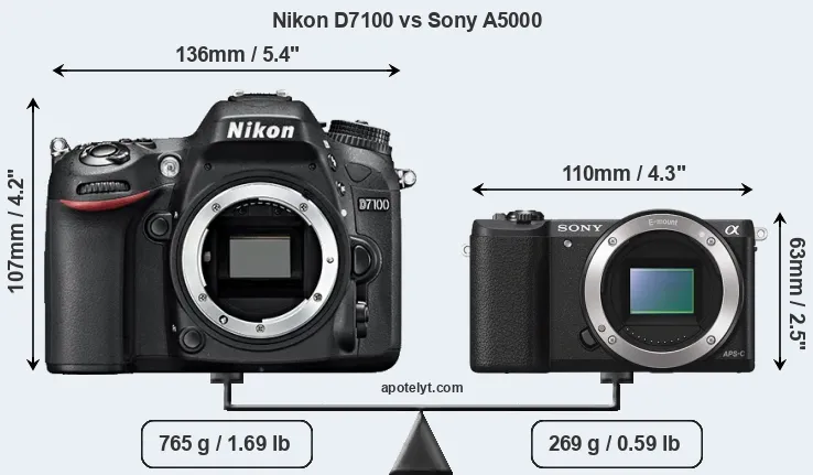An illustration of the physical size and weight of the Nikon D7100 and the Sony A5000 is provided in the side-by-side display below. The two cameras are presented according to their relative size. Three successive views from the front, the top, and the rear are shown. All width, height and depth dimensions are rounded to the nearest millimeter.