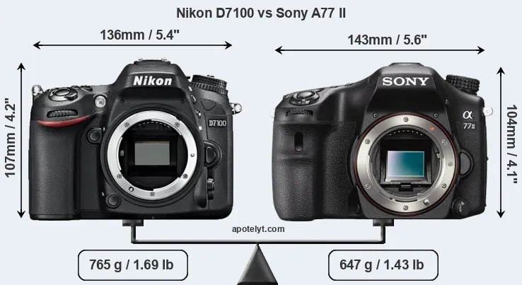 An illustration of the physical size and weight of the Nikon D7100 and the Sony A77 II is provided in the side-by-side display below. The two cameras are presented according to their relative size. Three successive views from the front, the top, and the rear are shown. All width, height and depth measures are rounded to the nearest millimeter.