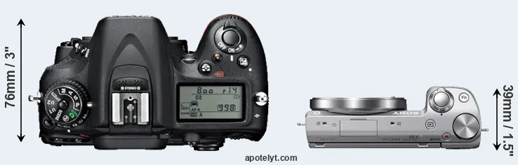 The side-by-side display below illustrates the physical size and weight of the Nikon D7100 and the Sony NEX-5T. The two cameras are presented according to their relative size. Three consecutive views from the front, the top, and the rear side are shown. All width, height and depth measures are rounded to the nearest millimeter.