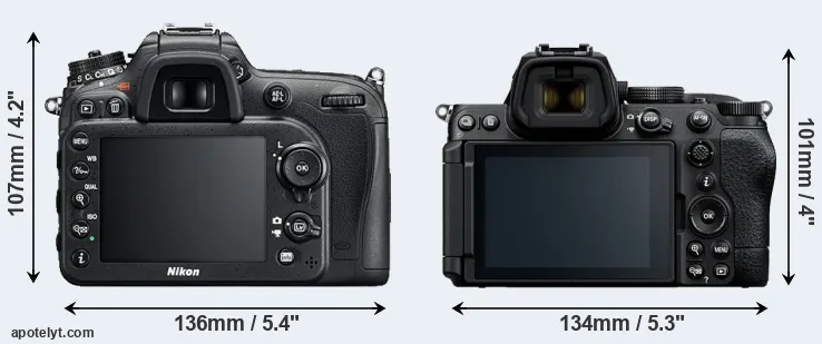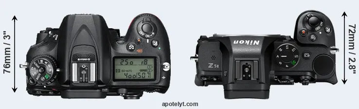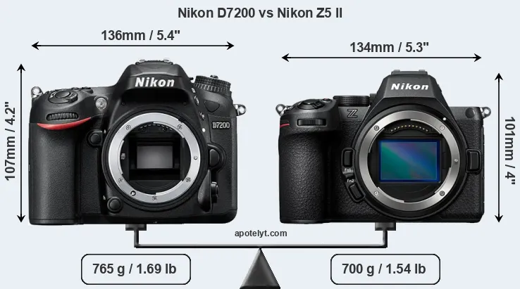 The side-by-side display below illustrates the physical size and weight of the Nikon D7200 and the Nikon Z5 II. The two cameras are presented according to their relative size. Three consecutive perspectives from the front, the top, and the back are available. All width, height and depth measures are rounded to the nearest millimeter.