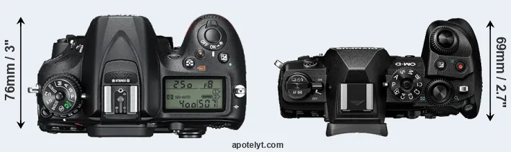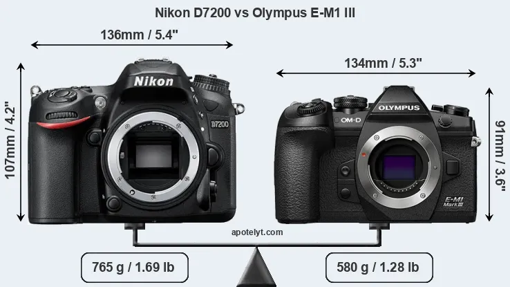 An illustration of the physical size and weight of the Nikon D7200 and the Olympus E-M1 III is provided in the side-by-side display below. The two cameras are presented according to their relative size. Three consecutive perspectives from the front, the top, and the back are available. All width, height and depth measures are rounded to the nearest millimeter.