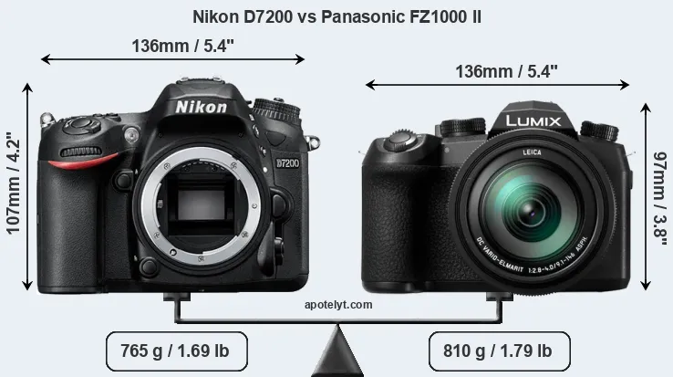 The physical size and weight of the Nikon D7200 and the Panasonic FZ1000 II are illustrated in the side-by-side display below. The two cameras are presented according to their relative size. Three successive views from the front, the top, and the rear are shown. All width, height and depth dimensions are rounded to the nearest millimeter.