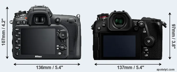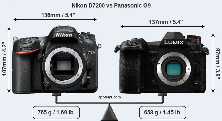 The physical size and weight of the Nikon D7200 and the Panasonic G9 are illustrated in the side-by-side display below. The two cameras are presented according to their relative size. Three consecutive views from the front, the top, and the rear side are shown. All width, height and depth measures are rounded to the nearest millimeter.