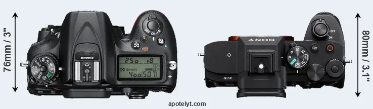 The side-by-side display below illustrates the physical size and weight of the Nikon D7200 and the Sony A7 IV. The two cameras are presented according to their relative size. Three consecutive views from the front, the top, and the rear side are shown. All width, height and depth dimensions are rounded to the nearest millimeter.
