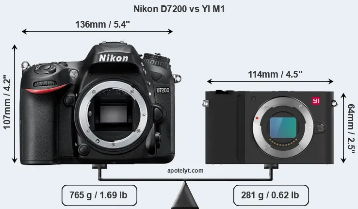 The side-by-side display below illustrates the physical size and weight of the Nikon D7200 and the YI M1. The two cameras are presented according to their relative size. Three consecutive perspectives from the front, the top, and the back are available. All width, height and depth dimensions are rounded to the nearest millimeter.