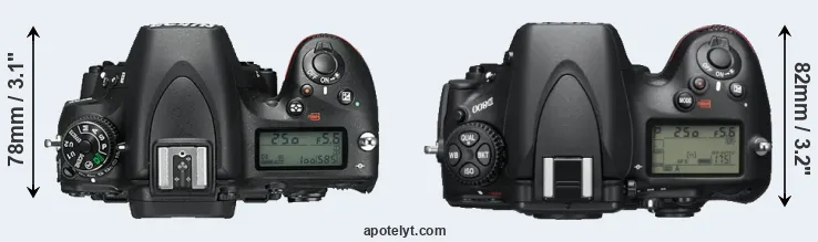 An illustration of the physical size and weight of the Nikon D750 and the Nikon D800 is provided in the side-by-side display below. The two cameras are presented according to their relative size. Three consecutive perspectives from the front, the top, and the back are available. All width, height and depth measures are rounded to the nearest millimeter.