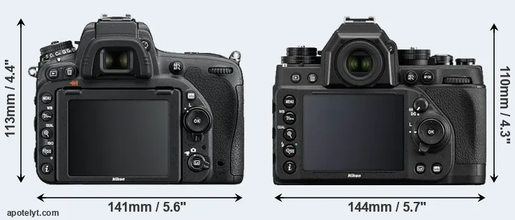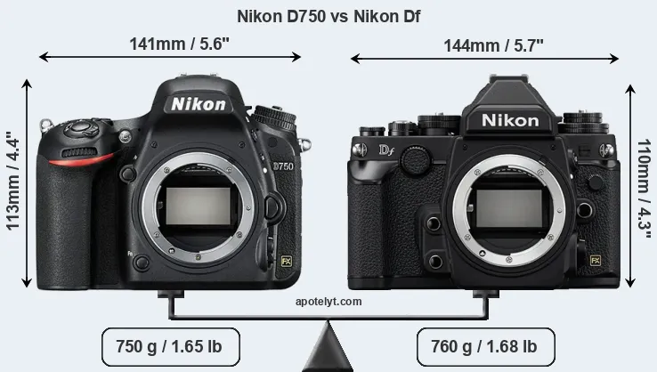 The side-by-side display below illustrates the physical size and weight of the Nikon D750 and the Nikon Df. The two cameras are presented according to their relative size. Three consecutive perspectives from the front, the top, and the back are available. All width, height and depth dimensions are rounded to the nearest millimeter.