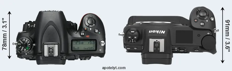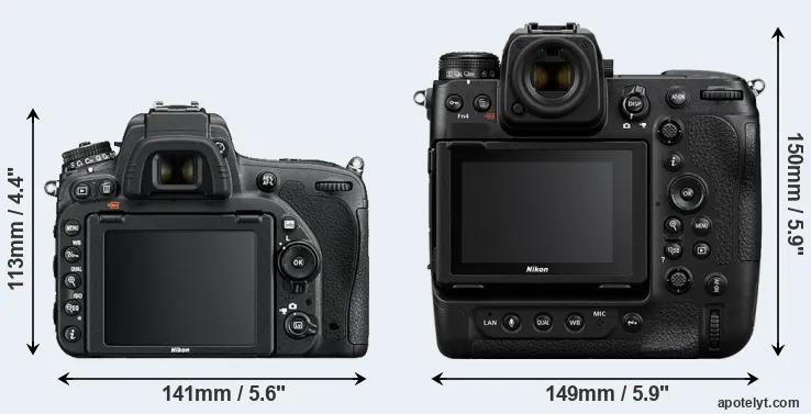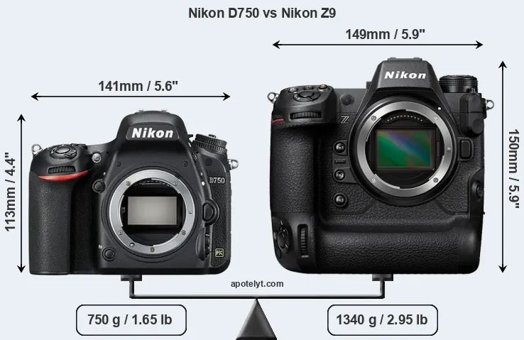 The side-by-side display below illustrates the physical size and weight of the Nikon D750 and the Nikon Z9. The two cameras are presented according to their relative size. Three consecutive perspectives from the front, the top, and the back are available. All width, height and depth measures are rounded to the nearest millimeter.