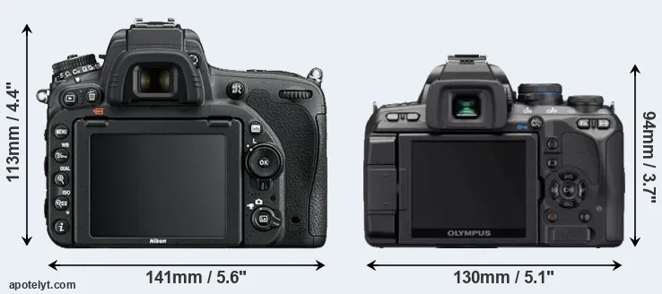 The side-by-side display below illustrates the physical size and weight of the Nikon D750 and the Olympus E-620. The two cameras are presented according to their relative size. Three consecutive perspectives from the front, the top, and the back are available. All width, height and depth dimensions are rounded to the nearest millimeter.
