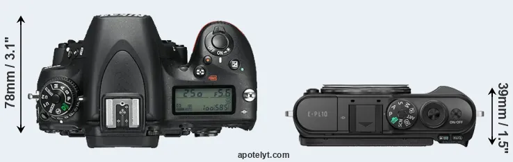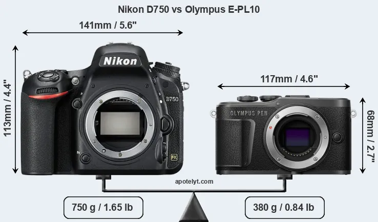 An illustration of the physical size and weight of the Nikon D750 and the Olympus E-PL10 is provided in the side-by-side display below. The two cameras are presented according to their relative size. Three consecutive perspectives from the front, the top, and the back are available. All size dimensions are rounded to the nearest millimeter.