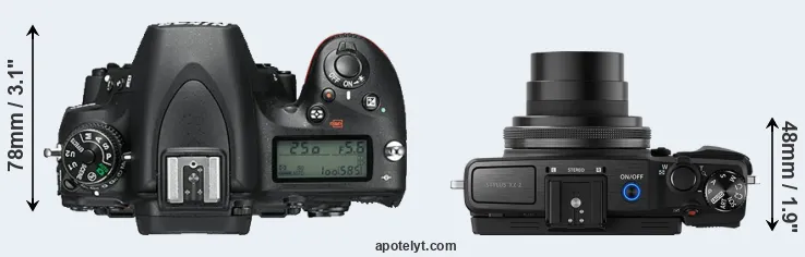 The side-by-side display below illustrates the physical size and weight of the Nikon D750 and the Olympus XZ-2. The two cameras are presented according to their relative size. Three successive views from the front, the top, and the rear are shown. All width, height and depth dimensions are rounded to the nearest millimeter.