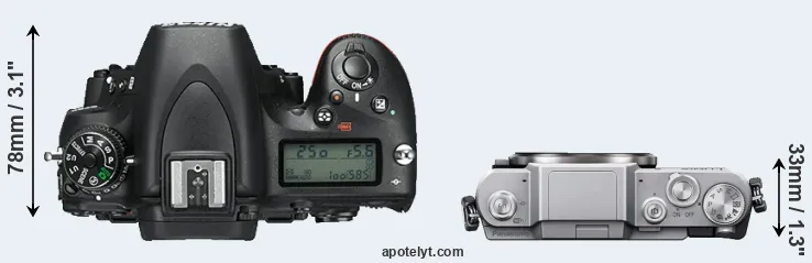 An illustration of the physical size and weight of the Nikon D750 and the Panasonic GF7 is provided in the side-by-side display below. The two cameras are presented according to their relative size. Three consecutive perspectives from the front, the top, and the back are available. All size dimensions are rounded to the nearest millimeter.