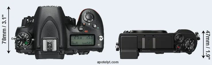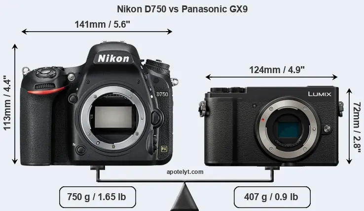 The physical size and weight of the Nikon D750 and the Panasonic GX9 are illustrated in the side-by-side display below. The two cameras are presented according to their relative size. Three consecutive perspectives from the front, the top, and the back are available. All width, height and depth measures are rounded to the nearest millimeter.