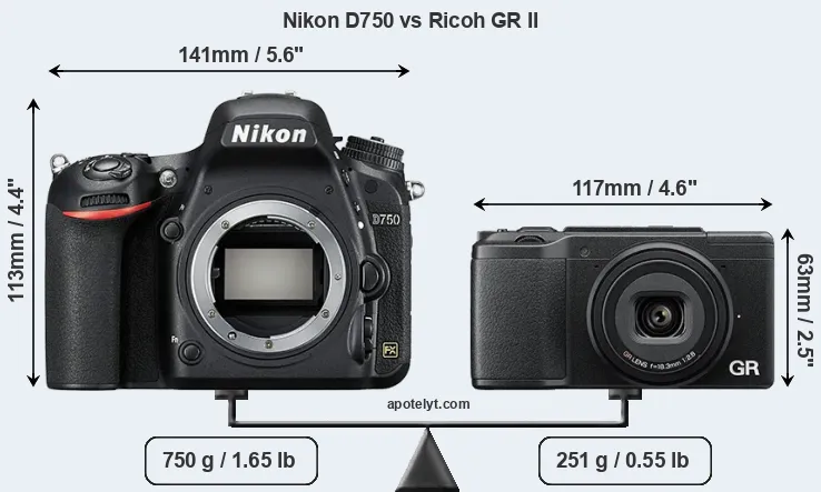An illustration of the physical size and weight of the Nikon D750 and the Ricoh GR II is provided in the side-by-side display below. The two cameras are presented according to their relative size. Three consecutive perspectives from the front, the top, and the back are available. All width, height and depth measures are rounded to the nearest millimeter.