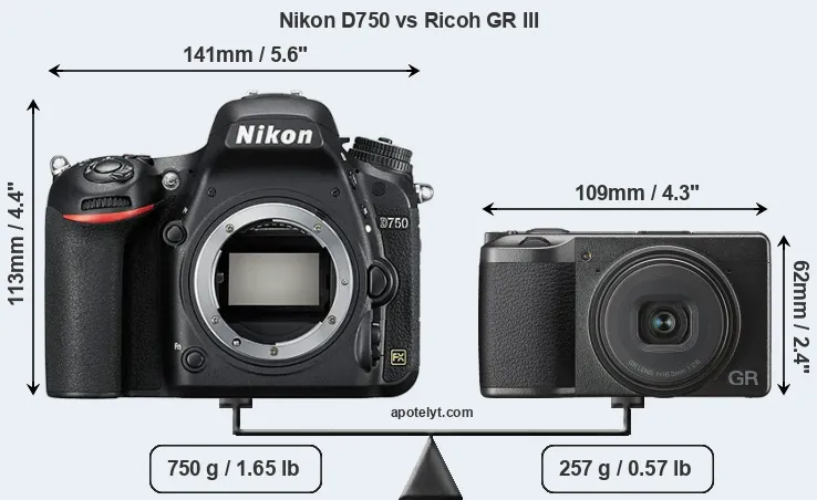 The side-by-side display below illustrates the physical size and weight of the Nikon D750 and the Ricoh GR III. The two cameras are presented according to their relative size. Three successive views from the front, the top, and the rear are shown. All width, height and depth dimensions are rounded to the nearest millimeter.