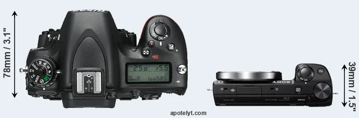 The side-by-side display below illustrates the physical size and weight of the Nikon D750 and the Sony NEX-5R. The two cameras are presented according to their relative size. Three consecutive views from the front, the top, and the rear side are shown. All width, height and depth dimensions are rounded to the nearest millimeter.