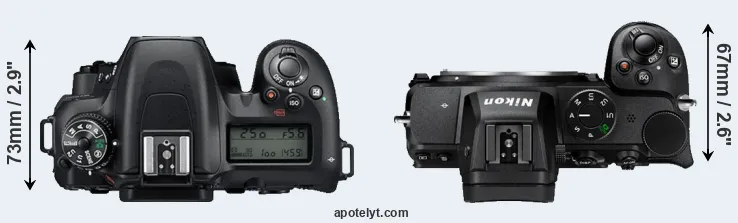 The physical size and weight of the Nikon D7500 and the Nikon Z5 are illustrated in the side-by-side display below. The two cameras are presented according to their relative size. Three consecutive perspectives from the front, the top, and the back are available. All width, height and depth dimensions are rounded to the nearest millimeter.