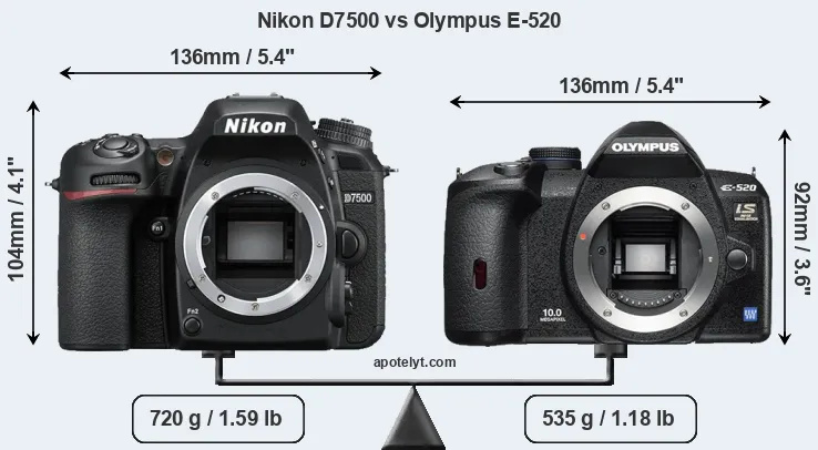 The physical size and weight of the Nikon D7500 and the Olympus E-520 are illustrated in the side-by-side display below. The two cameras are presented according to their relative size. Three consecutive perspectives from the front, the top, and the back are available. All width, height and depth dimensions are rounded to the nearest millimeter.
