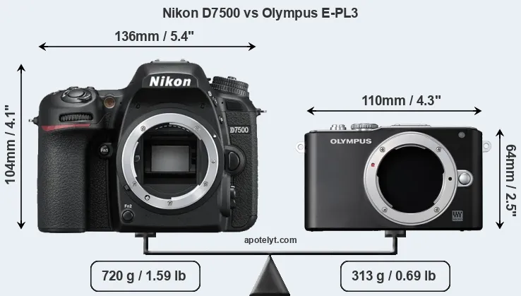 An illustration of the physical size and weight of the Nikon D7500 and the Olympus E-PL3 is provided in the side-by-side display below. The two cameras are presented according to their relative size. Three consecutive perspectives from the front, the top, and the back are available. All width, height and depth dimensions are rounded to the nearest millimeter.